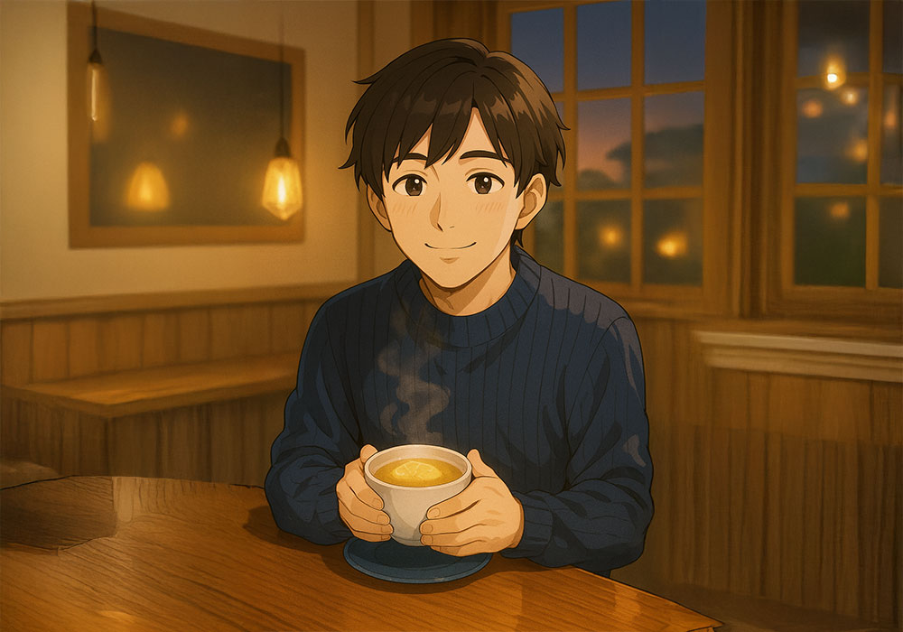 柚子茶と冬の息吹 冬の夜、《喫茶つむぎ》のカウンターには、ほのかに甘い柚子の香りが漂っていた。湯気とともに広がるその香りは、冬の冷たい空気をやさしく包み込んでいく。 扉のベルが鳴り、ギターケースを背負った三浦朝陽が入ってきた。「こんばんは…... -