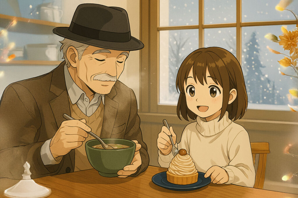 羊肉スープと栗のモンブラン 昼下がりの《喫茶つむぎ》。外は粉雪が舞い、ガラス越しに白い光がちらちらと揺れていた。カウンターでは、あんずが湯気の立つ鍋を見守っている。 扉のベルが鳴り、白髪にハットをかぶった男性が入ってきた。穏やかな笑みを浮... -