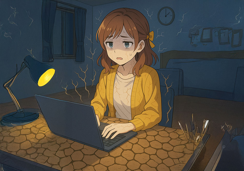 柚葉は夜の自室で、ノートパソコンに向かっていた。締め切りが迫るレポートは、真っ白なページのまま点滅しているカーソルだけが元気だ。加湿器はフル稼働で、モニターには「湿度70%」の数字。窓ガラスにはうっすら結露までついているのに、喉はカラカラ... -