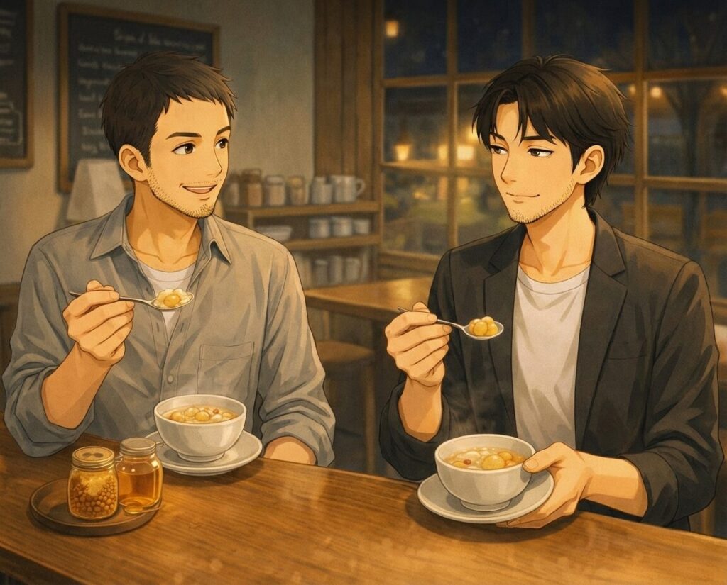 龍眼粥と灯らない夜 夜の《喫茶つむぎ》は、いつもより少し暗かった。脚立の上で、オーナーの蓮がぶら下がった丸い電球を指先でつついている。 「……寿命だな。はい、交換。」 カチリ、と新しい電球を回し込むと、ふわりと温かな光が戻った。そのタイミング... -